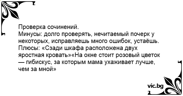 Минусы: долго проверять, нечитаемый почерк у некоторых, исправляешь много ошибок, устаёшь.