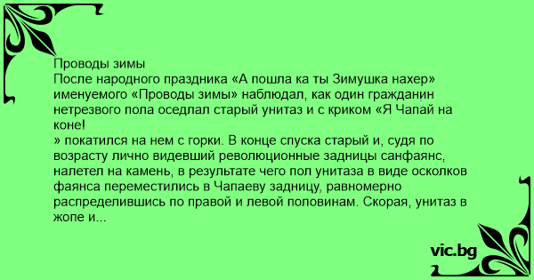 Проводы зимы После народного праздника «А пошла ка ты Зимушка нахер» именуемого «Проводы зимы» наблюдал, как один гражданин нетрезвого пола оседлал старый унитаз и с криком «Я Чапай на коне!