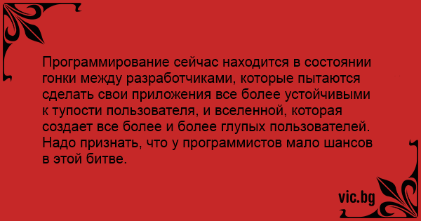 Программирование сейчас находится в состоянии гонки между разработчиками, которые пытаются сделать свои приложения все более устойчивыми к тупости пользователя, и вселенной, которая создает все более и более глупых пользователей.