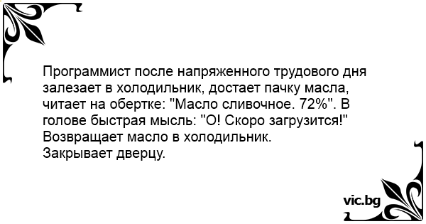 Програміст після напруженого трудового дня заглядає в холодильник, бере пачку масла, читає на обгортці: "Масло вершкове. 72%". У голові майнула думка: “О! Незабаром завантажиться!” Повертає масло...