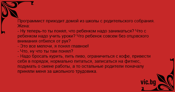 - Надо бросать курить, пить пиво, ограничиться с кофе, привести себя в порядок, нормально питаться, записаться на фитнес, подумать о смене работы, а то остальные родители поначалу приняли меня за школьного трудовика.