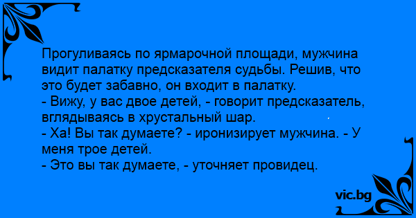 Een man loopt op de kermis en ziet de tent van een waarzegster. Dat wordt lachen, denkt hij, en gaat naar binnen. "Ik zie dat je de vader van twee kinderen bent," zegt de waarzegster, terwijl ze in...