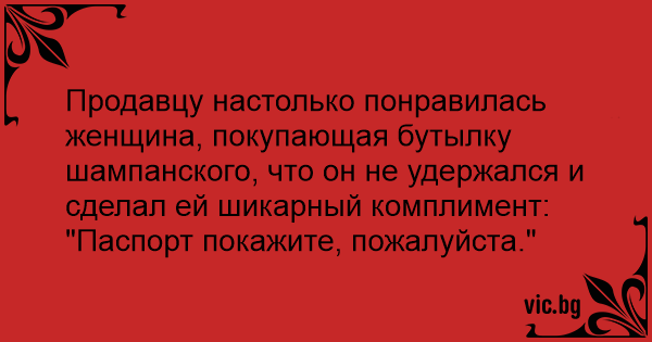Продавцу настолько понравилась женщина, покупающая бутылку шампанского, что он не удержался и сделал ей шикарный комплимент: