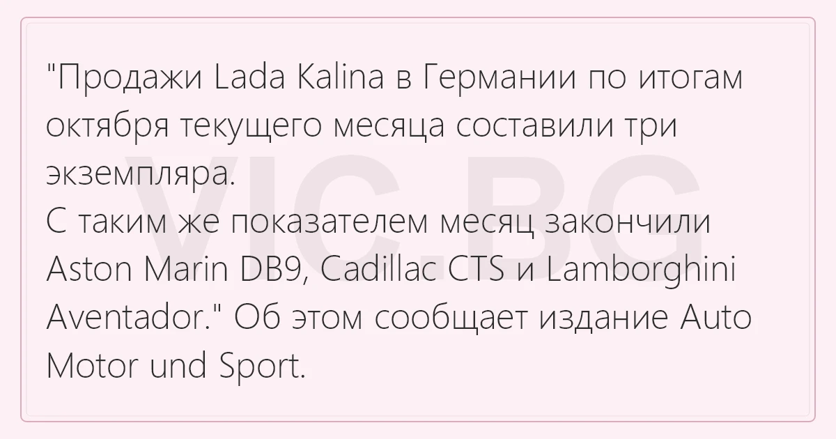 "Продажи Lada Kalina в Германии по итогам октября текущего месяца составили три экземпляра. С таким же показателем месяц закончили Aston Marin DB9, Cadillac CTS и Lamborghini Aventador." Об этом сообщает издание Auto Motor und Sport.