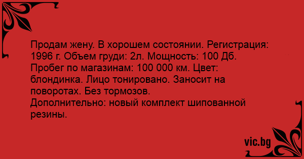 Продам жену. В хорошем состоянии. Регистрация: 1996 г. Объем груди: 2л. Мощность: 100 Дб.