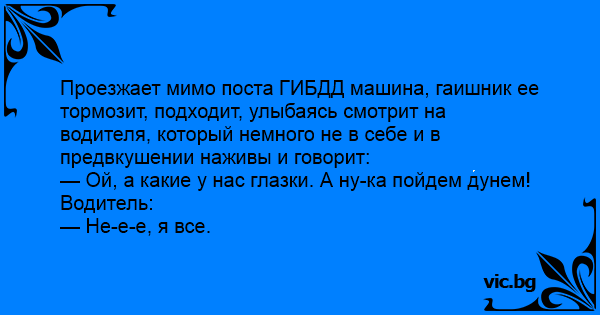 Проезжает мимо поста ГИБДД машина, гаишник ее тормозит, подходит, улыбаясь смотрит на водителя, который немного не в себе и в предвкушении наживы и говорит: