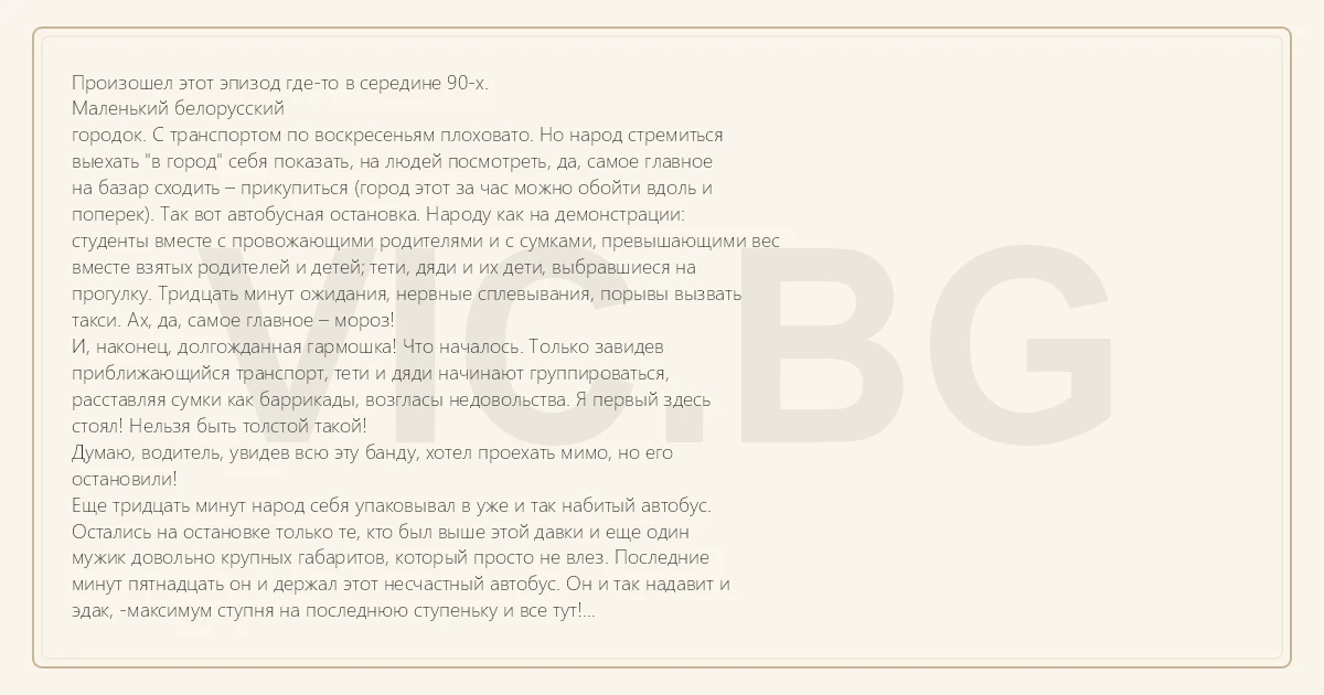 Произошел этот эпизод где-то в середине 90-х. Маленький белорусский городок. С транспортом по воскресеньям плоховато. Но народ стремиться выехать "в город" себя показать, на людей посмотреть, да, самое главное на базар сходить – прикупиться (город этот за час можно обойти вдоль и поперек). Так вот автобусная остановка. Народу как на демонстрации: студенты вместе с провожающими родителями и с сумками, превышающими вес вместе взятых родителей и детей; тети, дяди и их дети, выбравшиеся на прогулку. Тридцать минут ожидания, нервные сплевывания, порывы вызвать такси. Ах, да, самое главное – мороз! И, наконец, долгожданная гармошка! Что началось. Только завидев приближающийся транспорт, тети и дяди начинают группироваться, расставляя сумки как баррикады, возгласы недовольства. Я первый здесь стоял! Нельзя быть толстой такой! Думаю, водитель, увидев всю эту банду, хотел проехать мимо, но его остановили! Еще тридцать минут народ себя упаковывал в уже и так набитый автобус. Остались на остановке только те, кто был выше этой давки и еще один мужик довольно крупных габаритов, который просто не влез. Последние минут пятнадцать он и держал этот несчастный автобус. Он и так надавит и эдак, -максимум ступня на последнюю ступеньку и все тут! И о что тут происходит. Где-то еще в начале всего это процесса упаковки, старенькая сморщенная бабуля где-то вдали наращивала свой ход, пытаясь изо всех своих старческих сил не опоздать на автобус, который уже подъехал на остановку. Подковыляла она кое-как как раз в тот момент, когда габаритный мужик потерял надежду войти в группу пассажиров. Бабуля, отодвигая мужчинку, цепляясь за стоящего на последней ступеньке, повисает, как говорится в воздухе и орет – поехали, сынок! Тут водитель – бля, как поехали, я дверь закрыть не могу, прибью бабку на..х! А бабка орет: мне надо сыночки, дочаньки... поехали. Мужика, который не влез, тут на слезу пробило, то ли от смеха, то ли от жалости, и изо всех своих мужских сил он так пиханул бабку, что бабуля просто таки вросла в это "общее тело" пассажиров! Дверь закрылась! И перекошенное лицо старушки в маленьком окошечке улыбкой благодарило спасителя!
