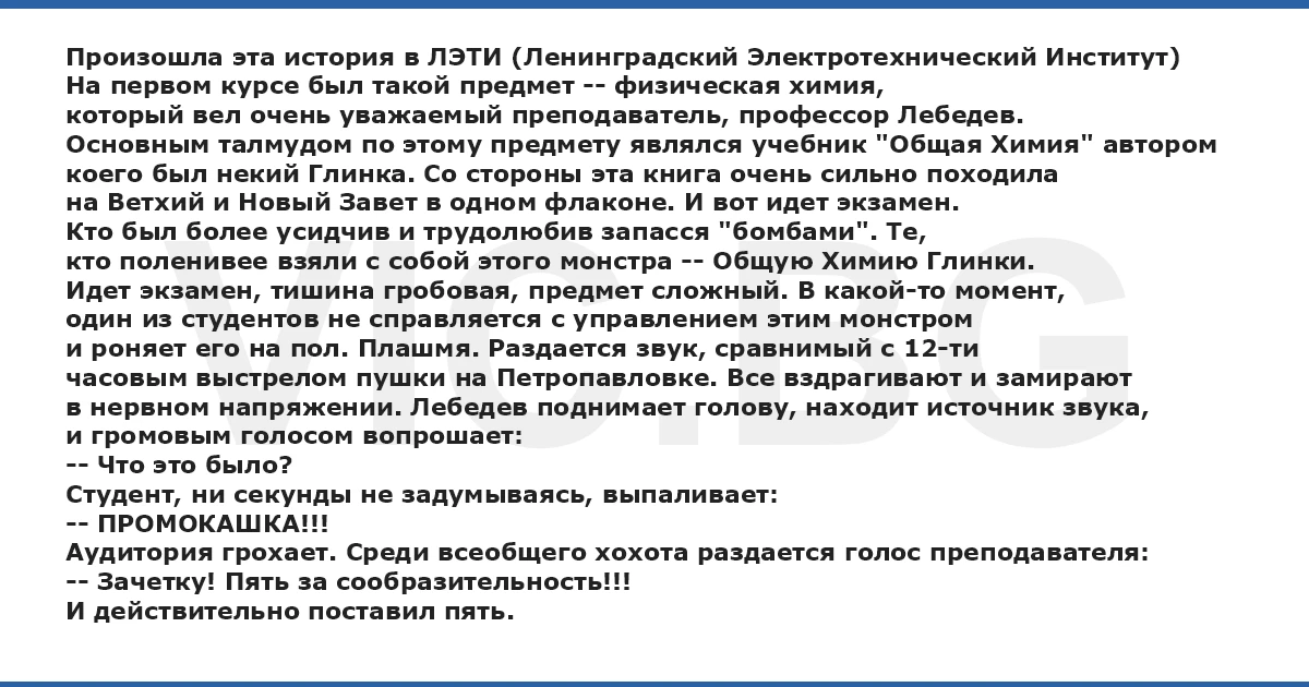 Произошла эта история в ЛЭТИ (Ленинградский Электротехнический Институт) На первом курсе был такой предмет -- физическая химия, который вел очень уважаемый преподаватель, профессор Лебедев. Основным талмудом по этому предмету являлся учебник "Общая Химия" автором коего был некий Глинка. Со стороны эта книга очень сильно походила на Ветхий и Новый Завет в одном флаконе. И вот идет экзамен. Кто был более усидчив и трудолюбив запасся "бомбами". Те, кто поленивее взяли с собой этого монстра -- Общую Химию Глинки. Идет экзамен, тишина гробовая, предмет сложный. В какой-то момент, один из студентов не справляется с управлением этим монстром и роняет его на пол. Плашмя. Раздается звук, сравнимый с 12-ти часовым выстрелом пушки на Петропавловке. Все вздрагивают и замирают в нервном напряжении. Лебедев поднимает голову, находит источник звука, и громовым голосом вопрошает: -- Что это было? Студент, ни секунды не задумываясь, выпаливает: -- ПРОМОКАШКА!!! Аудитория грохает. Среди всеобщего хохота раздается голос преподавателя: -- Зачетку! Пять за сообразительность!!! И действительно поставил пять.