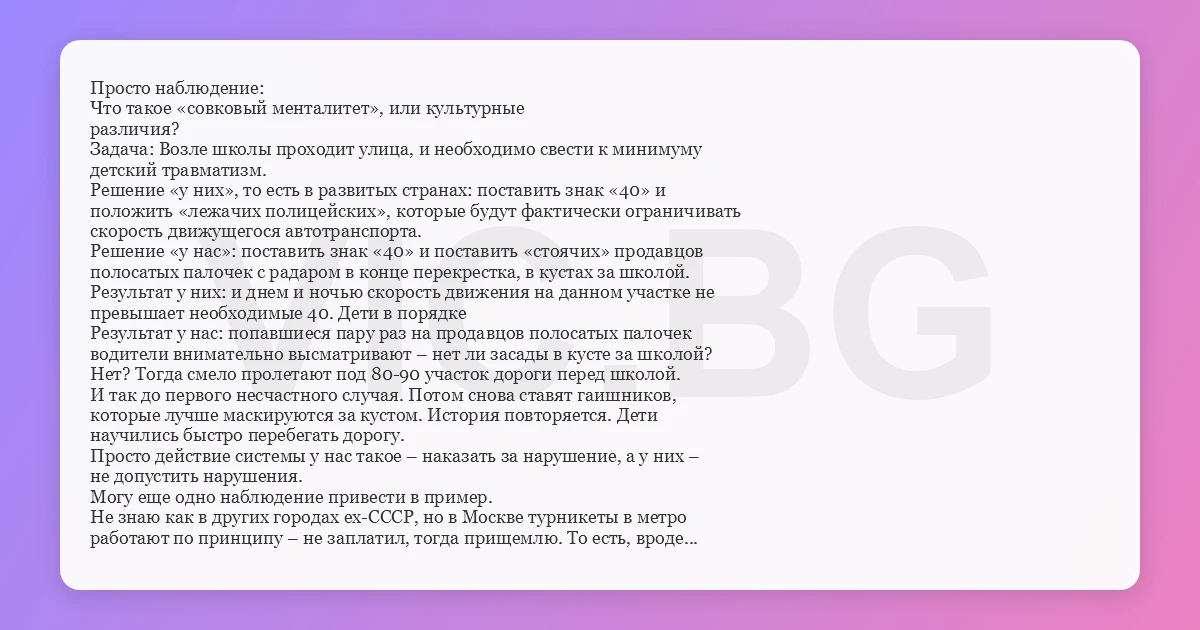 Просто наблюдение: Что такое «совковый менталитет», или культурные различия? Задача: Возле школы проходит улица, и необходимо свести к минимуму детский травматизм. Решение «у них», то есть в развитых странах: поставить знак «40» и положить «лежачих полицейских», которые будут фактически ограничивать скорость движущегося автотранспорта. Решение «у нас»: поставить знак «40» и поставить «стоячих» продавцов полосатых палочек с радаром в конце перекрестка, в кустах за школой. Результат у них: и днем и ночью скорость движения на данном участке не превышает необходимые 40. Дети в порядке Результат у нас: попавшиеся пару раз на продавцов полосатых палочек водители внимательно высматривают – нет ли засады в кусте за школой? Нет? Тогда смело пролетают под 80-90 участок дороги перед школой. И так до первого несчастного случая. Потом снова ставят гаишников, которые лучше маскируются за кустом. История повторяется. Дети научились быстро перебегать дорогу. Просто действие системы у нас такое – наказать за нарушение, а у них – не допустить нарушения. Могу еще одно наблюдение привести в пример. Не знаю как в других городах ex-СССР, но в Москве турникеты в метро работают по принципу – не заплатил, тогда прищемлю. То есть, вроде проход свободный – иди смело, но если не заплатил, то турникет резко закрывается перед тобой, по ходу оставив синяки на ногах, или прищемив еще что-нибудь. В развитых странах принцип работы другой – пока не заплатишь, не откроюсь. То есть турникет закрыт, а после оплаты открывается. Вот и получается – что сначала менталитет и принцип работы надо менять, тогда и будет у нас капитализмь. Dake d’Astana