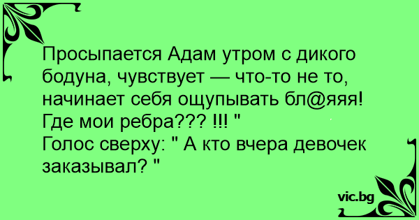 Просыпается Адам утром с дикого бодуна, чувствует — что-то не то, начинает себя ощупывать бл@яяя! Где мои ребра??? !!! "