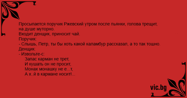 Просыпается поручик Ржевский утром после пьянки, голова трещит, на душе муторно.