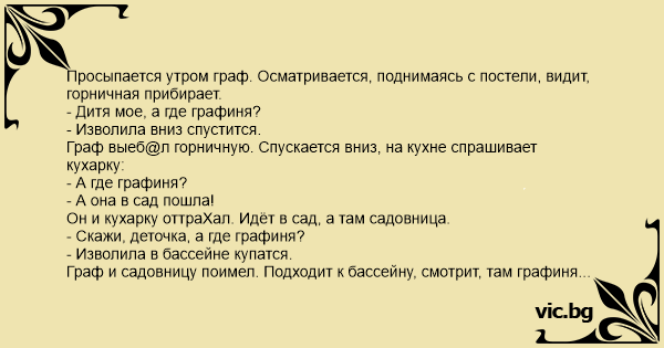 Граф выеб@л горничную. Спускается вниз, на кухне спрашивает кухарку: