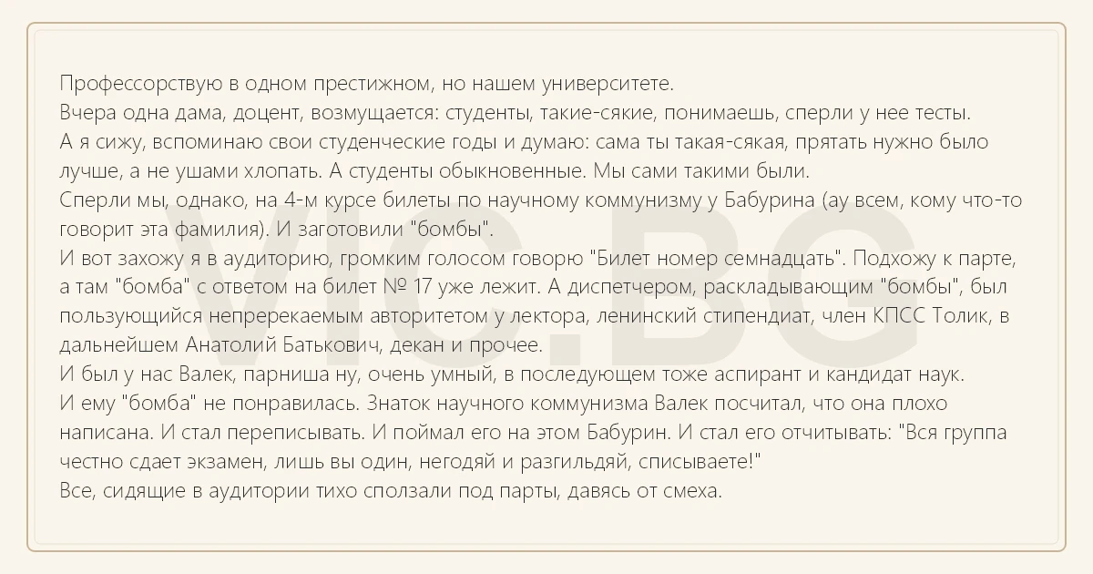 Профессорствую в одном престижном, но нашем университете. Вчера одна дама, доцент, возмущается: студенты, такие-сякие, понимаешь, сперли у нее тесты. А я сижу, вспоминаю свои студенческие годы и думаю: сама ты такая-сякая, прятать нужно было лучше, а не ушами хлопать. А студенты обыкновенные. Мы сами такими были. Сперли мы, однако, на 4-м курсе билеты по научному коммунизму у Бабурина (ау всем, кому что-то говорит эта фамилия). И заготовили "бомбы". И вот захожу я в аудиторию, громким голосом говорю "Билет номер семнадцать". Подхожу к парте, а там "бомба" с ответом на билет № 17 уже лежит. А диспетчером, раскладывающим "бомбы", был пользующийся непререкаемым авторитетом у лектора, ленинский стипендиат, члeн КПСС Толик, в дальнейшем Анатолий Батькович, декан и прочее. И был у нас Валек, парниша ну, очень умный, в последующем тоже аспирант и кандидат наук. И ему "бомба" не понравилась. Знаток научного коммунизма Валек посчитал, что она плохо написана. И стал переписывать. И поймал его на этом Бабурин. И стал его отчитывать: "Вся группа честно сдает экзамен, лишь вы один, негодяй и разгильдяй, списываете!" Все, сидящие в аудитории тихо сползали под парты, давясь от смеха.