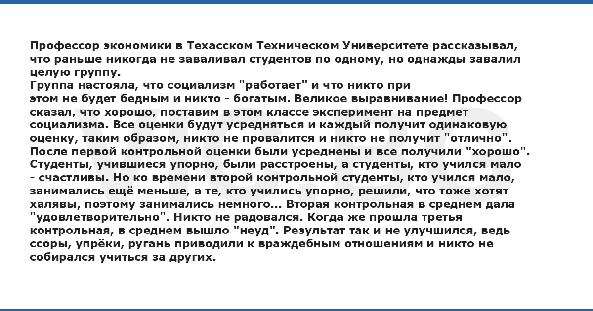 Профессор экономики в Техасском Техническом Университете рассказывал, что раньше никогда не заваливал студентов по одному, но однажды завалил целую группу. Группа настояла, что социализм "работает" и что никто при этом не будет бедным и никто - богатым. Великое выравнивание! Профессор сказал, что хорошо, поставим в этом классе эксперимент на предмет социализма. Все оценки будут усредняться и каждый получит одинаковую оценку, таким образом, никто не провалится и никто не получит "отлично". После первой контрольной оценки были усреднены и все получили "хорошо". Студенты, учившиеся упорно, были расстроены, а студенты, кто учился мало - счастливы. Но ко времени второй контрольной студенты, кто учился мало, занимались ещё меньше, а те, кто учились упорно, решили, что тоже хотят халявы, поэтому занимались немного... Вторая контрольная в среднем дала "удовлетворительно". Никто не радовался. Когда же прошла третья контрольная, в среднем вышло "неуд". Результат так и не улучшился, ведь ссоры, упрёки, ругань приводили к враждебным отношениям и никто не собирался учиться за других.