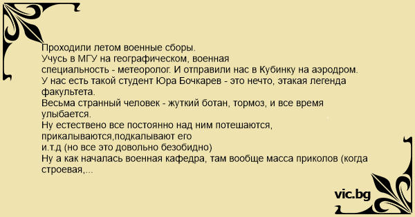 Проходили летом военные сборы. Учусь в МГУ на географическом, военная специальность - метеоролог. И отправили нас в Кубинку на аэродром. У нас есть такой студент Юра Бочкарев - это нечто, этакая легенда факультета. Весьма странный человек - жуткий ботан, тормоз, и все время улыбается. Ну естествено все постоянно над ним потешаются, прикалываются,подкалывают его и.т.д (но все это довольно безобидно) Ну а как началась военная кафедра, там вообще масса приколов (когда строевая, всякие обращения по военному - ну совершенно это ему не удавалось и выглядело всегда жутко смешно) Как сказал наш подпол: "Бочкарев, ну совершенно не военный человек" Ессно на сборах ему пришлось еще труднее, на второй день Юра стал легндой роты, в которой мы жили, а к концу сборов на него со всей части приходили смотреть солдаты. Все офицеры и прапора тоже Юру приметили и тоже постоянно подтрунивали над ним. Суть самой истории заключается даже не в Юре, а просто в армейской логике, но особый колорит ей придает именно он, как непосредственный участник Когда мы приехали, то естественно к военной жизни и правилам не обучены, да и соблюдать все не хотелось. И в тумбочки положили все что только можно (а лежать там должно по уставу толко мыльное-рыльное, тетрадь да ручка), у нас же лежало все - от одежды до всякой жратвы (это вообще категорически запрещено). Ну естественно про это прознало местное начальство, причем нач.части пришел посмотреть как устроились студенты, заглянул в тумбочки и oхуeл, после чего учинил разнос командиру роты. Командиром роты в тот день был капитан - такой толстый и весь из себя важный, но очень любивший поприкалываться (а порой и поиздеваться) над солдатами, и конечно студентами. Он постоянно подчеркивал в себе этакую неотесанность и грубость, и строил из себя очень строгого командира. Ну после того, как ему ком.части устроил пропиздон, он решил устроить его нам, и когда мы после строевой вечером вернулись в казарму, он решил построить нас в две шеренги перед кроватями, и по очереди стал нас взывать к тумбочкам чтобы подробно выяснить - что мы там храним. Начал он конечно с Бочкарева. Вынул при нем все из его тумбочки, а там и жратва в перемешку с вонючими носками, и куча каких-то непонятный аксессуаров, фотоаппарат такой здоровый советский и еще куча всего. Диалог: - Бочкарев - Я - Иди сюда, мой золотой Бочкарев подходит к тумбочке - Скажи зачем тебе это? (показывая на грязные носки) Бочкарев что-то мямлит Далее капитан спрашивает про фотоаппарат, еще про что-то, и находит карту московской области, которую Юра взял с собой, как истинный географ. Далее: - Бочкарев, ну скажи мне, зачем тебе вот это (поднимает и демонстрирует карту всему строю) - Ну... Чтобы знать, где я нахожусь Говорит Бочкарев, имея ввиду расположение части относительно разных городов и дорог, а также относительно Москвы - Бля Бочкарев..., ты совсем что ли oхуeл, я просто охуеваю с тебя. Ну ты выйди за ворота там огромными буквами написано КУ-БИН-КА!!!!!! Нам было очень смешно.