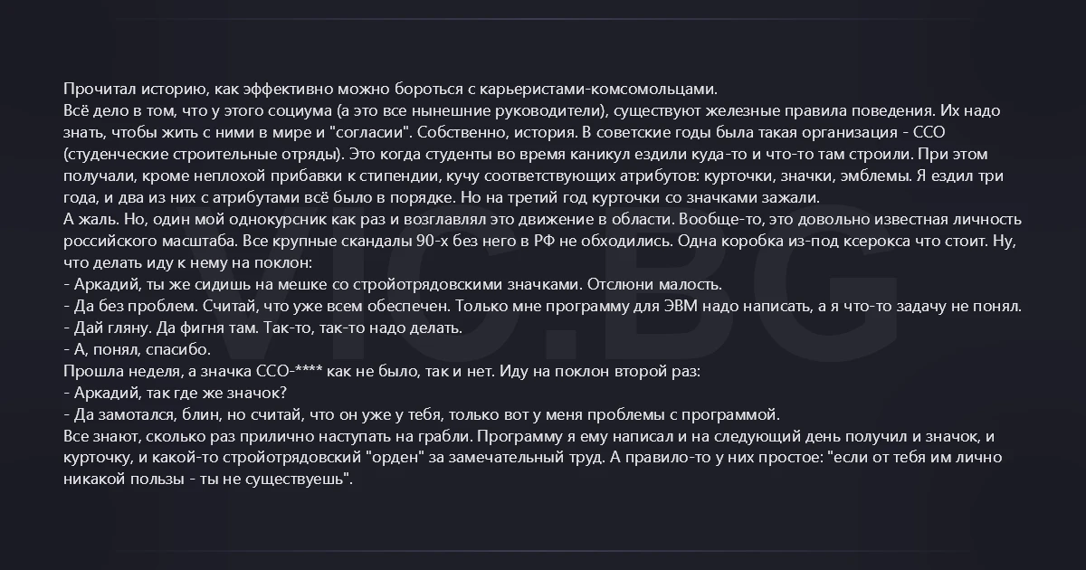 Прочитал историю, как эффективно можно бороться с карьеристами-комсомольцами. Всё дело в том, что у этого социума (а это все нынешние руководители), существуют железные правила поведения. Их надо знать, чтобы жить с ними в мире и "согласии". Собственно, история. В советские годы была такая организация - ССО (студенческие строительные отряды). Это когда студенты во время каникул ездили куда-то и что-то там строили. При этом получали, кроме неплохой прибавки к стипендии, кучу соответствующих атрибутов: курточки, значки, эмблемы. Я ездил три года, и два из них с атрибутами всё было в порядке. Но на третий год курточки со значками зажали. А жаль. Но, один мой однокурсник как раз и возглавлял это движение в области. Вообще-то, это довольно известная личность российского масштаба. Все крупные скандалы 90-х без него в РФ не обходились. Одна коробка из-под ксерокса что стоит. Ну, что делать иду к нему на поклон: - Аркадий, ты же сидишь на мешке со стройотрядовскими значками. Отслюни малость. - Да без проблем. Считай, что уже всем обеспечен. Только мне программу для ЭВМ надо написать, а я что-то задачу не понял. - Дай гляну. Да фигня там. Так-то, так-то надо делать. - А, понял, спасибо. Прошла неделя, а значка ССО-**** как не было, так и нет. Иду на поклон второй раз: - Аркадий, так где же значок? - Да замотался, блин, но считай, что он уже у тебя, только вот у меня проблемы с программой. Все знают, сколько раз прилично наступать на грабли. Программу я ему написал и на следующий день получил и значок, и курточку, и какой-то стройотрядовский "орден" за замечательный труд. А правило-то у них простое: "если от тебя им лично никакой пользы - ты не существуешь".