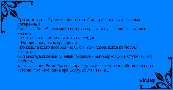 Прочитал тут в "Лучших прошлых лет" историю про выигрышный лотерейный билет на "Волгу", вспомнил историю прочитанную в книге-альманахе нашего институтского юмора (Физтех - навсегда! ). История вроде как правдивая. Произошла гдето посередине 60-х и 70-х годов, когда ректором института был многоуважаемый ученый, академик Белоцерковский. Студенты его любили, за глаза звали Билл, был он справедлив и честен.. вот собственно пара историй про него, одна про Волгу, другая так, в нагрузку:) 1. Один студент каким-то неведомым образом стал обладателем лотерейного билета (вряд ли добровольно купил, все же про матожидание студенты-математики в курсе, может в профсоюзе дали) и выиграл по нему Волгу. Волга студенту-немосквичу, да и без прав, не нужна - взял деньгами. Напоил в хлам и дым всю свою группу. Приказ об отчислении за несоответствующее поведение лег на стол Биллу для подписи. Билл сказал: - если бы я в его ситуации не напоил бы группу, мне в глаза бы наплевали. Студента оставили в покое. 2. В те милые добрые времена в институтской столовой всегда продавали пиво (Физтех был и, надеюсь, остается, элитным ВУЗом, и со снабжением там всегда все было в порядке). В ректорат стали поступать жалобы, что студенты напиваются и приходят на лекции пьяными. Билл выпустил приказ для институтских столовых: больше двух ящиков пива в одни руки не отпускать.