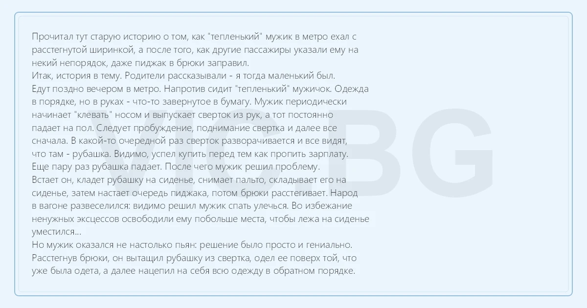 Прочитал тут старую историю о том, как "тепленький" мужик в метро ехал с расстегнутой ширинкой, а после того, как другие пассажиры указали ему на некий непорядок, даже пиджак в брюки заправил. Итак, история в тему. Родители рассказывали - я тогда маленький был. Едут поздно вечером в метро. Напротив сидит "тепленький" мужичок. Одежда в порядке, но в руках - что-то завернутое в бумагу. Мужик периодически начинает "клевать" носом и выпускает сверток из рук, а тот постоянно падает на пол. Следует пробуждение, поднимание свертка и далее все сначала. В какой-то очередной раз сверток разворачивается и все видят, что там - рубашка. Видимо, успел купить перед тем как пропить зарплату. Еще пару раз рубашка падает. После чего мужик решил проблему. Встает он, кладет рубашку на сиденье, снимает пальто, складывает его на сиденье, затем настает очередь пиджака, потом брюки расстегивает. Народ в вагоне развеселился: видимо решил мужик спать улечься. Во избежание ненужных эксцессов освободили ему побольше места, чтобы лежа на сиденье уместился... Но мужик оказался не настолько пьян: решение было просто и гениально. Расстегнув брюки, он вытащил рубашку из свертка, одел ее поверх той, что уже была одета, а далее нацепил на себя всю одежду в обратном порядке.