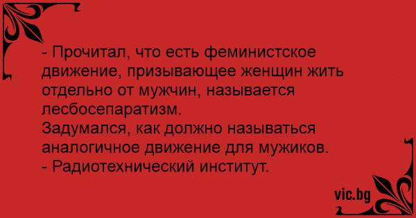 - Прочитал, что есть феминистское движение, призывающее женщин жить отдельно от мужчин, называется лесбосепаратизм.
