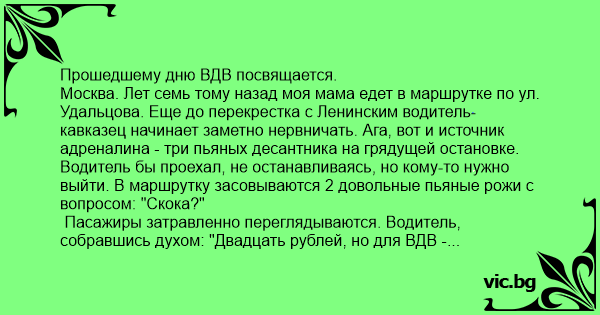 Москва. Лет семь тому назад моя мама едет в маршрутке по ул. Удальцова. Еще до перекрестка с Ленинским водитель-кавказец начинает заметно нервничать. Ага, вот и источник адреналина - три пьяных десантника на грядущей остановке. Водитель бы проехал, не останавливаясь, но кому-то нужно выйти. В маршрутку засовываются 2 довольные пьяные рожи с вопросом: "Скока?"