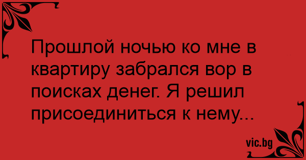 Прошлой ночью ко мне в квартиру забрался вор в поисках денег. Я решил присоединиться к нему...