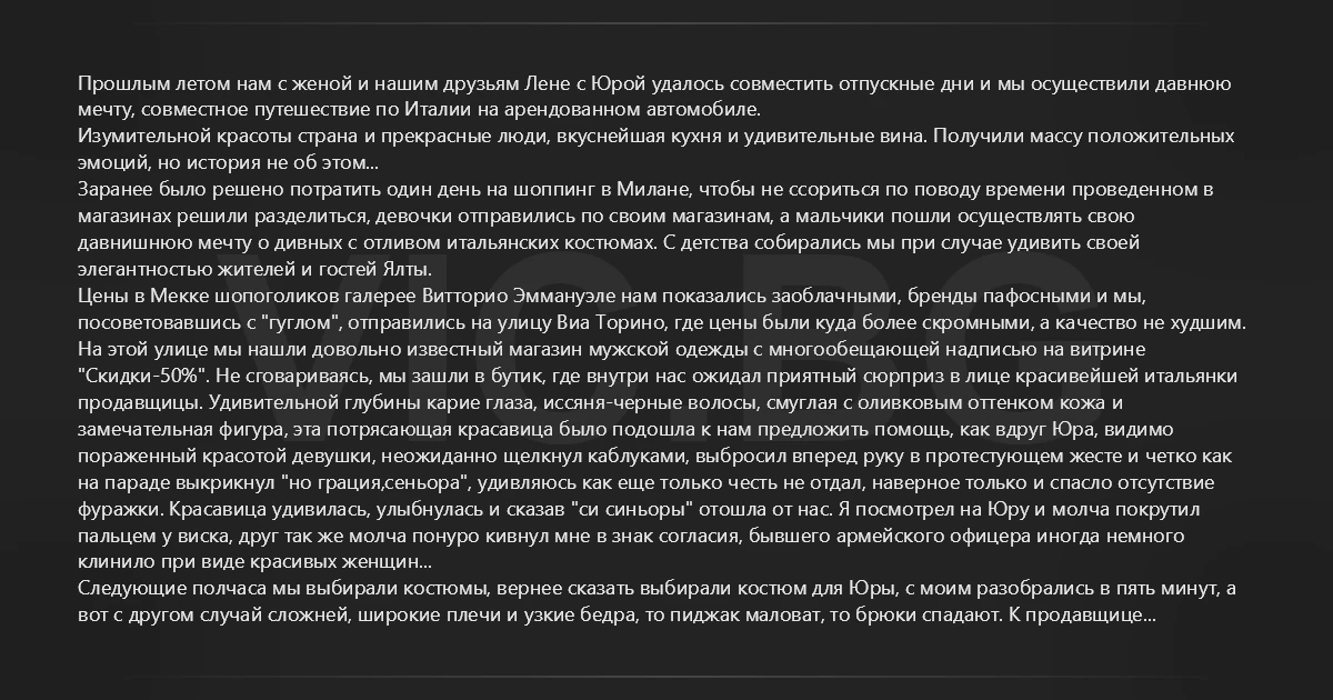 Прошлым летом нам с женой и нашим друзьям Лене с Юрой удалось совместить отпускные дни и мы осуществили давнюю мечту, совместное путешествие по Италии на арендованном автомобиле. Изумительной красоты страна и прекрасные люди, вкуснейшая кухня и удивительные вина. Получили массу положительных эмоций, но история не об этом... Заранее было решено потратить один день на шоппинг в Милане, чтобы не ссориться по поводу времени проведенном в магазинах решили разделиться, девочки отправились по своим магазинам, а мальчики пошли осуществлять свою давнишнюю мечту о дивных с отливом итальянских костюмах. С детства собирались мы при случае удивить своей элегантностью жителей и гостей Ялты. Цены в Мекке шопоголиков галерее Витторио Эммануэле нам показались заоблачными, бренды пафосными и мы, посоветовавшись с "гуглом", отправились на улицу Виа Торино, где цены были куда более скромными, а качество не худшим. На этой улице мы нашли довольно известный магазин мужской одежды с многообещающей надписью на витрине "Скидки-50%". Не сговариваясь, мы зашли в бутик, где внутри нас ожидал приятный сюрприз в лице красивейшей итальянки продавщицы. Удивительной глубины карие глаза, иссяня-черные волосы, смуглая с оливковым оттенком кожа и замечательная фигура, эта потрясающая красавица было подошла к нам предложить помощь, как вдруг Юра, видимо пораженный красотой девушки, неожиданно щелкнул каблуками, выбросил вперед руку в протестующем жесте и четко как на параде выкрикнул "но грация,сеньора", удивляюсь как еще только честь не отдал, наверное только и спасло отсутствие фуражки. Красавица удивилась, улыбнулась и сказав "си синьоры" отошла от нас. Я посмотрел на Юру и молча покрутил пальцем у виска, друг так же молча понуро кивнул мне в знак согласия, бывшего армейского офицера иногда немного клинило при виде красивых женщин... Следующие полчаса мы выбирали костюмы, вернее сказать выбирали костюм для Юры, с моим разобрались в пять минут, а вот с другом случай сложней, широкие плечи и узкие бедра, то пиджак маловат, то брюки спадают. К продавщице обращаться после того как мы ее так лихо отшили было неудобно и я предложил Юре взять брюки и пиджак с двух комплектов разных размеров. - ..Вы я смотрю такие умные, что того и гляди строем пойдете! Может быть все же помочь попросите? - низким грудным голосом на русском языке совершенно без акцента и смеясь над нашими недоуменными лицами сказала красавица "итальянка". Вот тут нам с Юркой стало очень стыдно и неудобно, дело в том что выбирая костюмы мы попутно обсуждали внешность, фигуру и предполагаемый возраст прекрасной продавщицы... - Да не парьтесь вы так, мальчики, - заметив наше замешательство и смущение сказала девушка, - ничего пошлого я от вас не услышала и если честно, то даже интересно было, а насчет возраста вы мне вообще сильно польстили. После знакомства оказалось, что зовут девушку Юлией, по маме русская, по отцу татарка, родилась и училась в Челябинске, более десяти лет назад познакомилась посредством интернета с итальянцем и через время вышла за него замуж, родила ребенка и счастлива в браке. Что же до внешности, то не только мы ошибались, все уверены, что она настоящая итальянка, выдает ее только акцент. В итоге Юля выбрала для меня совершенно другой костюм, а также помогла Юре и с выбором и с размером. Взявши с