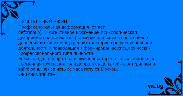 Профессиональная деформация (от лат. deformatio) — когнитивное искажение, психологическая дезориентация личности, формирующаяся из-за постоянного давления внешних и внутренних факторов профессиональной деятельности и приводящая к формированию специфически-профессионального типа личности. Режиссер, два оператора и звукооператор, вот и вся небольшая съемочная группа, которая добралась до какой-то затерянной в тайге зоны, аж за четыре часа лету от Москвы. Они снимали там фильм об одном тамошнем знаменитом заключенном. Со временем все подружились со свирепым «хозяином» зоны – высоким седым полковником, ведь при ближайшем рассмотрении, он оказался вполне милым, малопьющим, интеллигентным человеком. Полковник тоже тянулся к гостям из Москвы, без них и поговорить то не с кем в тамошней глухомани, уж не то что Бродского наизусть декламировать. Подчиненные от Бродского, ну совсем далеки, в конце-концов, не со «шнырями» же из хозобслуги дружить? Так они все вместе и засиживались далеко за полночь за богатым столом со столичной водкой, местными поросятами и жареными гусями. И вот, наступил предпоследний день съемок, завтра домой. После легкого формального «шмона», группа со своими кофрами и штативами привычно вошла в зону, где ей преградил дорогу марширующий отряд, халтурно-поющих зеков. Группа остановилась и спокойно пережидала, вслушиваясь в слова песни, как вдруг из строя раздался крик: - «Сергей! Серега! Батов!» Звукооператор встрепенулся, вытянул шею, вгляделся в нескончаемую серую массу и заорал в ответ: - «Саня! Романов! Ты!?» Жизнь – есть жизнь, одноклассников не выбирают. Песня смолкла, отряд остановился и звукооператор рванулся сквозь толпу зеков к своему непутевому однокласснику. Встретились, обнялись, седой, беззубый зек Саня Романов, даже всплакнул от нахлынувших чувств, но тут дали команду продолжать движение и зэки двинулись дальше, только уже без песни. Вечером того же дня, «хозяин» зоны организовал особо-пышный прощальный ужин. Завтра еще полдня съемок и в аэропорт. Все было как всегда, но все же не совсем, помимо огромного стола, в углу у дверей стоял маленький круглый столик сервированный на одного. Сервированный богато и даже со своим гусем, но все же на одного. Все начали рассаживаться за большой стол, но полковник неожиданно, как бы извиняясь, обратился к звукооператору: - Сергей, у меня к вам большая просьба, вы не могли бы сесть за вон тот отдельный столик? Он ничем не хуже и даже удобнее, соблюдем, так сказать формальности… - Почему за отдельный? Что за формальности? - Как бы вам это объяснить…? Вы конечно не были в курсе, но заключенный Романов, если можно так сказать «опущенный», он в свое время «фуфло задвинул» - Что «задвинул»? - Проиграл в карты и не смог вовремя вернуть долг. - А я тут при чем? - Ну, вы же с ним утром контактировали. Конечно же это не ваша вина, вы не были в курсе, но поймите и меня, в зоне свои порядки и законы… После некоторой паузы, звукорежиссер не сказав ни слова, покинул комнату, за ним вышла и вся группа. На следующее утро, когда были сняты последние кадры на плацу, настало время собираться и уезжать. Полковник лично пришел проводить съемочную группу и старательно делал вид, что ничего такого вчера не произошло. Мимо проходил все тот же флегматично-поющий отряд зеков, как вдруг, звукооператор Сергей брос