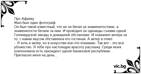 Но фотограф не забыл. Подключил связи, где улыбнулся, где пообещал, где подмазал - и получил-таки доступ к съемкам. И актер не соврал, и мастерство не подвело - фотографии получились отличные. Из глянцевого журнала фото попали в специализированные журналы по дизайну и прикладному искусству, потом в желтую прессу. Мировые агентства разнесли их по всему свету, включая Банановую Республику.