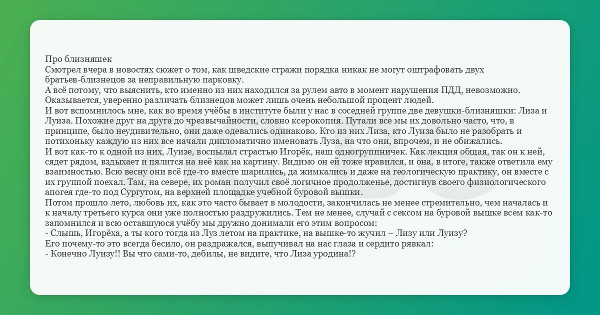 И вот вспомнилось мне, как во время учёбы в институте были у нас в соседней группе две девушки-близняшки: Лиза и Луиза. Похожие друг на друга до чрезвычайности, словно ксерокопия. Путали все мы их довольно часто, что, в принципе, было неудивительно, они даже одевались одинаково. Кто из них Лиза, кто Луиза было не разобрать и потихоньку каждую из них все начали дипломатично именовать Луза, на что они, впрочем, и не обижались.