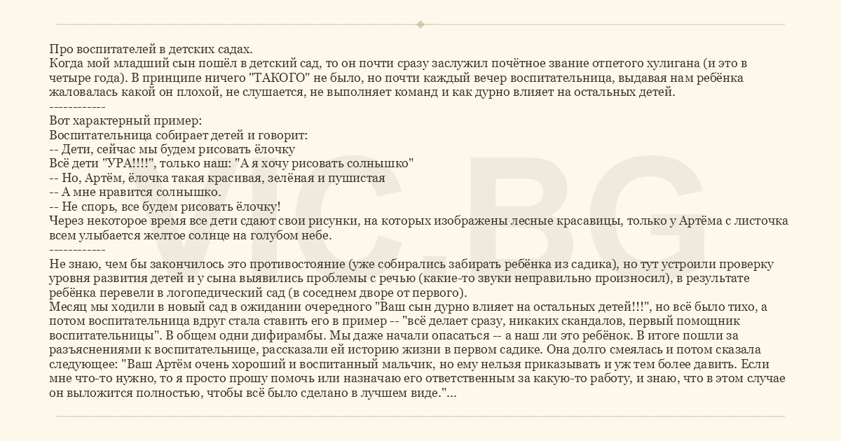 Про воспитателей в детских садах. Когда мой младший сын пошёл в детский сад, то он почти сразу заслужил почётное звание отпетого хулигана (и это в четыре года). В принципе ничего "ТАКОГО" не было, но почти каждый вечер воспитательница, выдавая нам ребёнка жаловалась какой он плохой, не слушается, не выполняет команд и как дурно влияет на остальных детей. ------------ Вот характерный пример: Воспитательница собирает детей и говорит: -- Дети, сейчас мы будем рисовать ёлочку Всё дети "УРА!!!!", только наш: "А я хочу рисовать солнышко" -- Но, Артём, ёлочка такая красивая, зелёная и пушистая -- А мне нравится солнышко. -- Не спорь, все будем рисовать ёлочку! Через некоторое время все дети сдают свои рисунки, на которых изображены лесные красавицы, только у Артёма с листочка всем улыбается желтое солнце на голубом небе. ------------ Не знаю, чем бы закончилось это противостояние (уже собирались забирать ребёнка из садика), но тут устроили проверку уровня развития детей и у сына выявились проблемы с речью (какие-то звуки неправильно произносил), в результате ребёнка перевели в логопедический сад (в соседнем дворе от первого). Месяц мы ходили в новый сад в ожидании очередного "Ваш сын дурно влияет на остальных детей!!!", но всё было тихо, а потом воспитательница вдруг стала ставить его в пример -- "всё делает сразу, никаких скандалов, первый помощник воспитательницы". В общем одни дифирамбы. Мы даже начали опасаться -- а наш ли это ребёнок. В итоге пошли за разъяснениями к воспитательнице, рассказали ей историю жизни в первом садике. Она долго смеялась и потом сказала следующее: "Ваш Артём очень хороший и воспитанный мальчик, но ему нельзя приказывать и уж тем более давить. Если мне что-то нужно, то я просто прошу помочь или назначаю его ответственным за какую-то работу, и знаю, что в этом случае он выложится полностью, чтобы всё было сделано в лучшем виде." Огромное спасибо нашей воспитательнице, что она не дала сломать ребёнка...