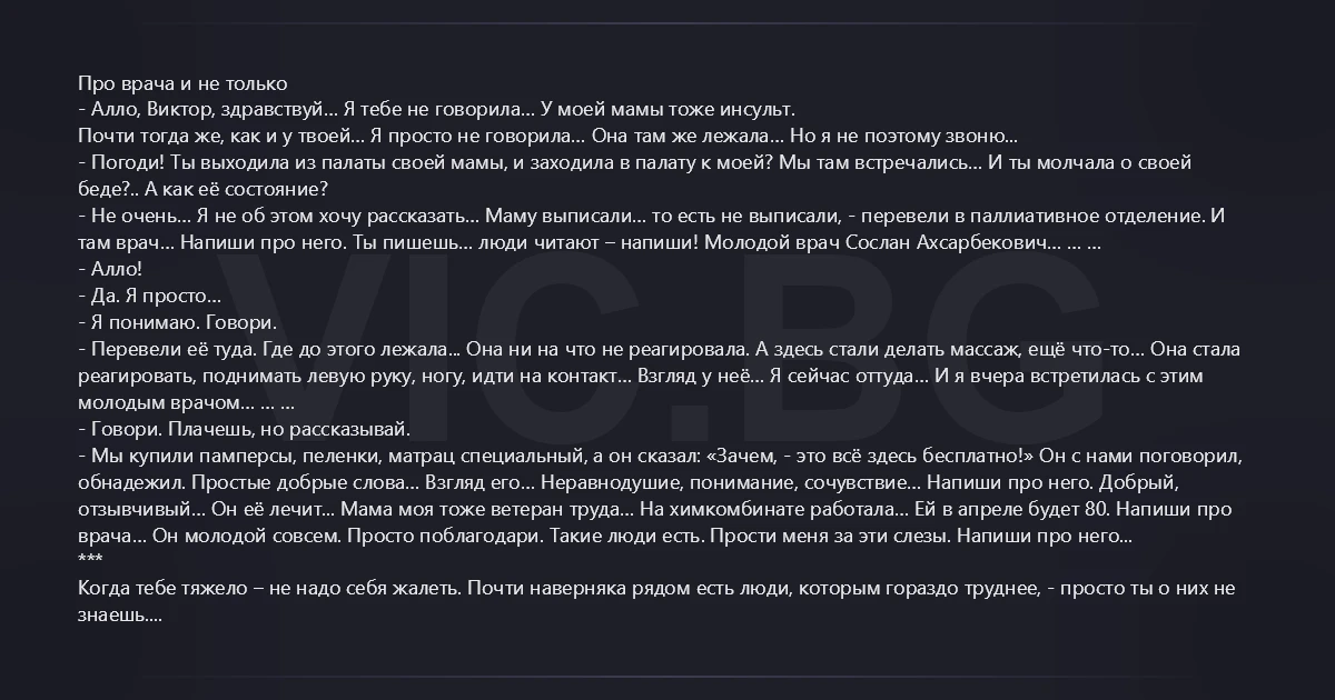 - Не очень… Я не об этом хочу рассказать… Маму выписали… то есть не выписали, - перевели в паллиативное отделение. И там врач… Напиши про него. Ты пишешь… люди читают – напиши! Молодой врач Сослан Ахсарбекович… … …