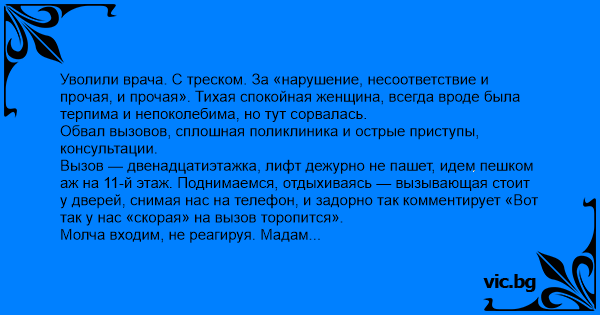 Уволили врача. С треском. За «нарушение, несоответствие и прочая, и прочая». Тихая спокойная женщина, всегда вроде была терпима и непоколебима, но тут сорвалась.