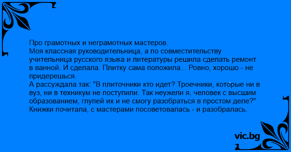 Моя классная руководительница, а по совместительству учительница русского языка и литературы решила сделать ремонт в ванной. И сделала. Плитку сама положила... Ровно, хорошо - не придерешься.