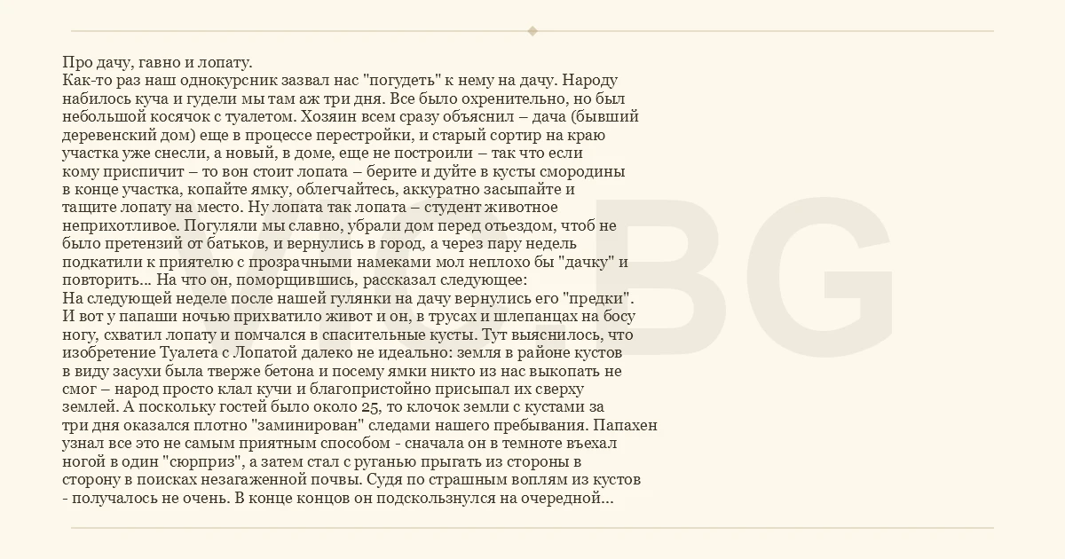 Про дачу, гabнo и лопату. Как-то раз наш однокурсник зазвал нас "погудеть" к нему на дачу. Народу набилось куча и гудели мы там аж три дня. Все было охренительно, но был небольшой косячок с туалетом. Хозяин всем сразу объяснил – дача (бывший деревенский дом) еще в процессе перестройки, и старый сортир на краю участка уже снесли, а новый, в доме, еще не построили – так что если кому приспичит – то вон стоит лопата – берите и дуйте в кусты смородины в конце участка, копайте ямку, облегчайтесь, аккуратно засыпайте и тащите лопату на место. Ну лопата так лопата – студент животное неприхотливое. Погуляли мы славно, убрали дом перед отьездом, чтоб не было претензий от батьков, и вернулись в город, а через пару недель подкатили к приятелю с прозрачными намеками мол неплохо бы "дачку" и повторить... На что он, поморщившись, рассказал следующее: На следующей неделе после нашей гулянки на дачу вернулись его "предки". И вот у папаши ночью прихватило живот и он, в трусах и шлепанцах на босу ногу, схватил лопату и помчался в спасительные кусты. Тут выяснилось, что изобретение Туалета с Лопатой далеко не идеально: земля в районе кустов в виду засухи была тверже бетона и посему ямки никто из нас выкопать не смог – народ просто клал kучи и благопристойно присыпал их сверху землей. А поскольку гостей было около 25, то клочок земли с кустами за три дня оказался плотно "заминирован" следами нашего пребывания. Папахен узнал все это не самым приятным способом - сначала он в темноте въехал ногой в один "сюрприз", а затем стал с руганью прыгать из стороны в сторону в поисках незагаженной почвы. Судя по страшным воплям из кустов - получалось не очень. В конце концов он подскользнулся на очередной кучке и покрыл собой максимум "заминированной" площади... Не знаю, что папа сказал нашему приятелю вернувшись из "туалета", но на дачу тот нас больше не приглашал.