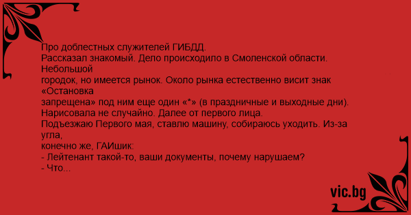 Про доблестных служителей ГИБДД. Рассказал знакомый. Дело происходило в Смоленской области. Небольшой городок, но имеется рынок. Около рынка естественно висит знак «Остановка запрещена» под ним еще один «*» (в праздничные и выходные дни). Нарисовала не случайно. Далее от первого лица. Подъезжаю Первого мая, ставлю машину, собираюсь уходить. Из-за угла, конечно же, ГАИшик: - Лейтенант такой-то, ваши документы, почему нарушаем? - Что нарушаю? - Вы что не видели знак, висит «Остановка запрещена»? - Видел. - А почему остановились? - Так май месяц на дворе. - И что? - Так товарищ лейтенант там же еще один знак висит, на нем снежинка нарисована. ГАИшник смотрит на меня удивленно и спрашивает: - И что это обозначает? Ну, я не растерялся и говорю: - Что остановка запрещена только в снегопад. Стою, наблюдаю за реакцией. Он документы посмотрел и …… отпустил. Вот так-то.