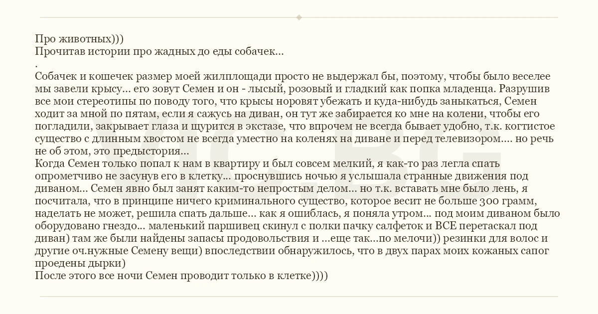 Собачек и кошечек размер моей жилплощади просто не выдержал бы, поэтому, чтобы было веселее мы завели крысу... его зовут Семен и он - лысый, розовый и гладкий как попка младенца. Разрушив все мои стереотипы по поводу того, что крысы норовят убежать и куда-нибудь заныкаться, Семен ходит за мной по пятам, если я сажусь на диван, он тут же забирается ко мне на колени, чтобы его погладили, закрывает глаза и щурится в экстазе, что впрочем не всегда бывает удобно, т.к. когтистое существо с длинным хвостом не всегда уместно на коленях на диване и перед телевизором.... но речь не об этом, это предыстория...