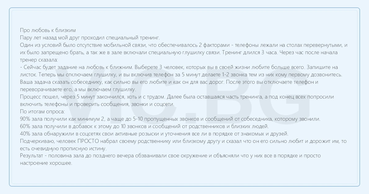 Про любовь к близким Пару лет назад мой друг проходил специальный тренинг. Один из условий было отсутствие мобильной связи, что обеспечивалось 2 факторами - телефоны лежали на столах перевернутыми, и их было запрещено брать, а так же в зале включали специальную глушилку связи. Тренинг длился 3 часа. Через час после начала тренер сказала: - Сейчас будет задание на любовь к ближним. Выберете 3 человек, которых вы в своей жизни любите больше всего. Запишите на листок. Теперь мы отключаем глушилку, и вы включив телефон за 5 минут делаете 1-2 звонка тем из них кому первому дозвонитесь. Ваша задача сказать собеседнику, как сильно вы его любите и как он для вас дорог. После этого вы отключаете телефон и переворачиваете его, а мы включаем глушилку. Процесс пошел, через 5 минут закончился, хоть и с трудом. Далее была оставшаяся часть тренинга, а под конец всех попросили включить телефоны и проверить сообщения, звонки и соцсети. По итогам опроса: 90% зала получили как минимум 2, а чаще до 5-10 пропущенных звонков и сообщений от собеседника, которому звонили. 60% зала получили в добавок к этому до 10 звонков и сообщений от родственников и близких людей. 40% зала обнаружили в соцсетях свои активные розыски и уточнения все ли в порядке от знакомых и друзей. Подчеркиваю, человек ПРОСТО набрал своему родственнику или близкому другу и сказал что он его сильно любит и дорожит им, то есть очевидную прописную истину. Результат - половина зала до позднего вечера обзванивали свое окружение и объясняли что у них все в порядке и просто настроение хорошее.