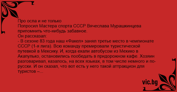 Про осла и не только Попросил Мастера спорта СССР Вячеслава Мурашкинцева припомнить что-нибудь забавное.