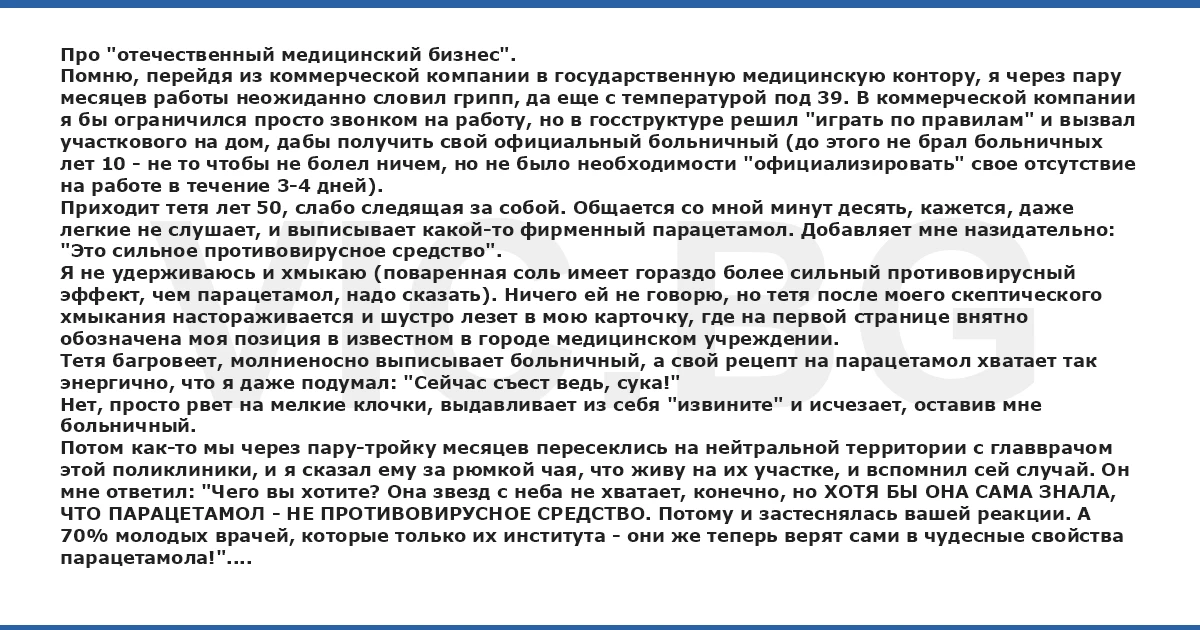 Про "отечественный медицинский бизнес". Помню, перейдя из коммерческой компании в государственную медицинскую контору, я через пару месяцев работы неожиданно словил грипп, да еще с температурой под 39. В коммерческой компании я бы ограничился просто звонком на работу, но в госструктуре решил "играть по правилам" и вызвал участкового на дом, дабы получить свой официальный больничный (до этого не брал больничных лет 10 - не то чтобы не болел ничем, но не было необходимости "официализировать" свое отсутствие на работе в течение 3-4 дней). Приходит тетя лет 50, слабо следящая за собой. Общается со мной минут десять, кажется, даже легкие не слушает, и выписывает какой-то фирменный парацетамол. Добавляет мне назидательно: "Это сильное противовирусное средство". Я не удерживаюсь и хмыкаю (поваренная соль имеет гораздо более сильный противовирусный эффект, чем парацетамол, надо сказать). Ничего ей не говорю, но тетя после моего скептического хмыкания настораживается и шустро лезет в мою карточку, где на первой странице внятно обозначена моя позиция в известном в городе медицинском учреждении. Тетя багровеет, молниеносно выписывает больничный, а свой рецепт на парацетамол хватает так энергично, что я даже подумал: "Сейчас съест ведь, cуka!" Нет, просто рвет на мелкие клочки, выдавливает из себя "извините" и исчезает, оставив мне больничный. Потом как-то мы через пару-тройку месяцев пересеклись на нейтральной территории с главврачом этой поликлиники, и я сказал ему за рюмкой чая, что живу на их участке, и вспомнил сей случай. Он мне ответил: "Чего вы хотите? Она звезд с неба не хватает, конечно, но ХОТЯ БЫ ОНА САМА ЗНАЛА, ЧТО ПАРАЦЕТАМОЛ - НЕ ПРОТИВОВИРУСНОЕ СРЕДСТВО. Потому и застеснялась вашей реакции. А 70% молодых врачей, которые только их института - они же теперь верят сами в чудесные свойства парацетамола!". Я отошел от главврача в глубокой задумчивости, размышляя о бренности своего бытия в условиях современной российской медицины...