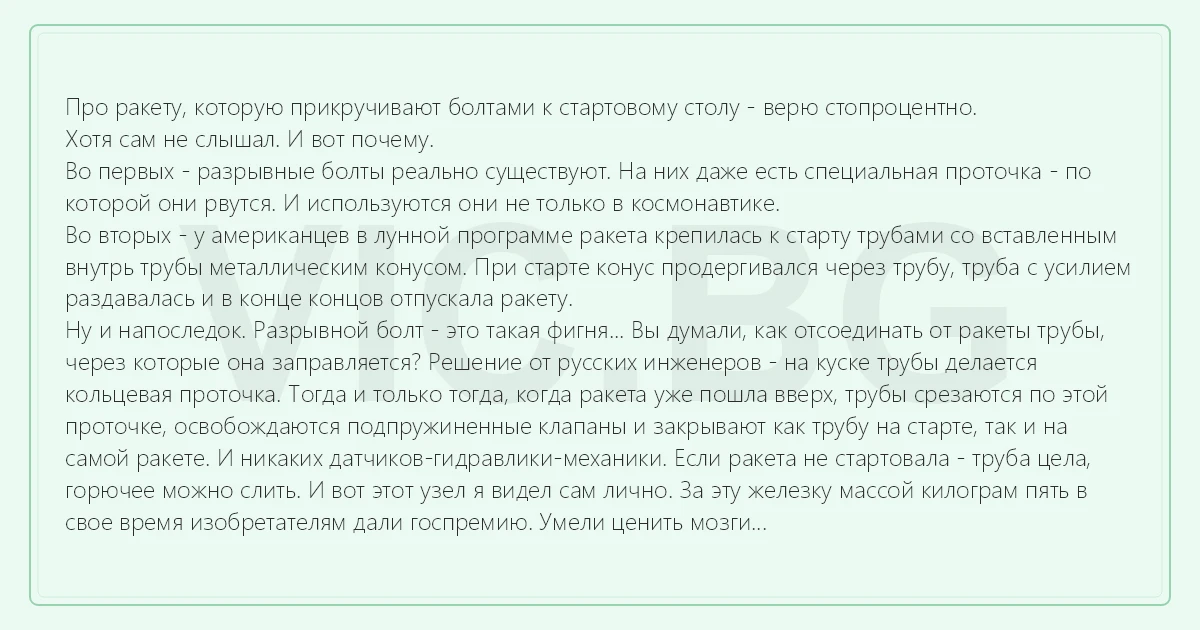Про ракету, которую прикручивают болтами к стартовому столу - верю стопроцентно. Хотя сам не слышал. И вот почему. Во первых - разрывные болты реально существуют. На них даже есть специальная проточка - по которой они рвутся. И используются они не только в космонавтике. Во вторых - у американцев в лунной программе ракета крепилась к старту трубами со вставленным внутрь трубы металлическим конусом. При старте конус продергивался через трубу, труба с усилием раздавалась и в конце концов отпускала ракету. Ну и напоследок. Разрывной болт - это такая фигня... Вы думали, как отсоединать от ракеты трубы, через которые она заправляется? Решение от русских инженеров - на куске трубы делается кольцевая проточка. Тогда и только тогда, когда ракета уже пошла вверх, трубы срезаются по этой проточке, освобождаются подпружиненные клапаны и закрывают как трубу на старте, так и на самой ракете. И никаких датчиков-гидравлики-механики. Если ракета не стартовала - труба цела, горючее можно слить. И вот этот узел я видел сам лично. За эту железку массой килограм пять в свое время изобретателям дали госпремию. Умели ценить мозги...