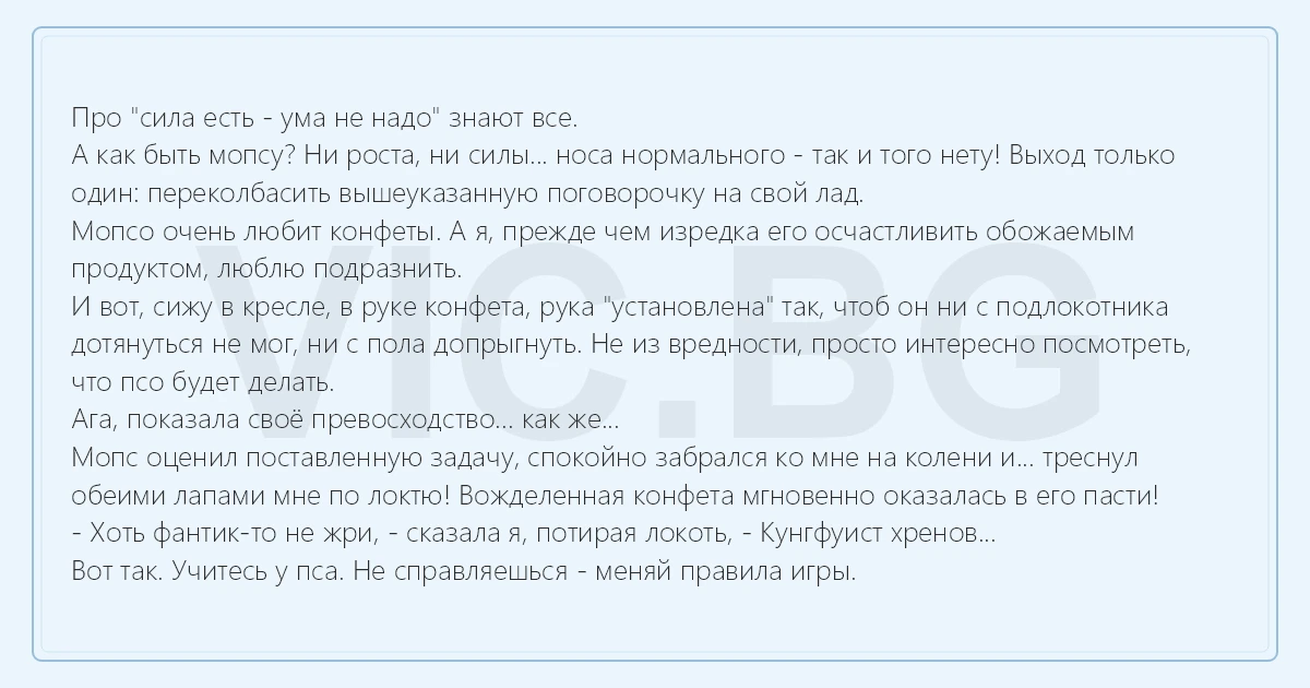 Про "сила есть - ума не надо" знают все. А как быть мопсу? Ни роста, ни силы... носа нормального - так и того нету! Выход только один: переколбасить вышеуказанную поговорочку на свой лад. Мопсо очень любит конфеты. А я, прежде чем изредка его осчастливить обожаемым продуктом, люблю подразнить. И вот, сижу в кресле, в руке конфета, рука "установлена" так, чтоб он ни с подлокотника дотянуться не мог, ни с пола допрыгнуть. Не из вредности, просто интересно посмотреть, что псо будет делать. Ага, показала своё превосходство... как же... Мопс оценил поставленную задачу, спокойно забрался ко мне на колени и... треснул обеими лапами мне по локтю! Вожделенная конфета мгновенно оказалась в его пасти! - Хоть фантик-то не жри, - сказала я, потирая локоть, - Кунгфуист хренов... Вот так. Учитесь у пса. Не справляешься - меняй правила игры.