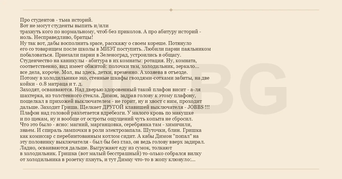 Про студентов - тьма историй. Вот не могут студенты выпить и/или трахнуть кого по нормальному, чтоб без приколов. А про абитуру историй - ноль. Несправедливо, братцы! Ну так вот, дабы восполнить space, расскажу о своем кореше. Потянуло его со товарищем после школы в МИЭТ поступить. Любили парни паяльником побаловаться. Приехали парни в Зеленоград, устроились в общагу. Студенчество на каникулы - абитура в их комнаты: ротация. Ну, комната, соответственно, вид имеет обжитой: полочки там, холодильник, зеркало... все дела, короче. Мол, вы здесь, детки, временно. А хозяева в отъезде. Потому в холодильнике эхо, стенные шкафы гвоздями-сотками забиты, на две койки - 0.8 матраца и т. д. Заходят, осваиваются. Над дверью здоровенный такой плафон висит - а-ля шахтерка, из толстенного стекла. Димон, задрав голову к этому плафону, пощелкал в прихожей выключателем - не горит, ну и хвост с ним, проходит дальше. Заходит Гриша. Щелкает ДРУГОЙ клавишей выключателя - JOBBS !!! Плафон над головой разлетается вдребезги. У малого кровь по макушке и по щекам, ну и вообще от остроты ощущений чуть копыта не сбросил. Что это было - ясно: магний, марганцовка, серебрянка там - химичили, знаем. И спираль лампочки в роли электрозапала. Шуточки, блин. Гришка как комиссар с перебинтованным котлом сидит. А кабы Димон "попал" на эту половинку выключателя - был бы без глаз, он ведь голову вверх задирал. Ладно, осваиваются дальше. Выгружают еду из сумок, толкают в холодильник. Гришка (вот малый бесстрашный) то-олько собрался вилку от холодильника в розетку пхнуть, и тут Димку что-то в жопу клюнуло: "Стой!!" - орет. Проверяют - заминировано! Бомба между полом и дном холодильника, здоровая. Аккурат по ногам. Ах ты ж е-мое! Злость ребят взяла. Раскурочили они заколоченную гвоздями антресоль - а там много барахла всякого, которое и домой везти в лом, и чужим оставлять - упрут. И, в частности, магнитофон "Юпитер" - гордость меломана, футы-нуты, ценнейший агрегат! ... АГА ... Как я уже сказал, паяльник парни хорошо освоили. Поэтому в момент починили холодильник и (вы догадались?) "зарядили" магнитофон. Аккуратно поставили на место. Гвоздики в дверки антресолей вставили. Tape-recorder mu$t die! Вот и вся сказка. Не поступили парни в МИЭТ и уехали домой, и больше в Зеленограде не были. Отзвуки этой истории до них не дошли, так что если кто-то погиб в результате взрыва, то, видимо, только "Юпитер". А может, кто-то знает, чем дело кончилось?
