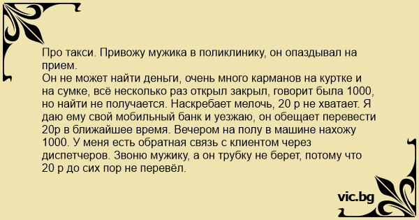 Он не может найти деньги, очень много карманов на куртке и на сумке, всё несколько раз открыл закрыл, говорит была 1000, но найти не получается. Наскребает мелочь, 20 р не хватает. Я даю ему свой мобильный банк и уезжаю, он обещает перевести 20р в ближайшее время. Вечером на полу в машине нахожу 1000. У меня есть обратная связь с клиентом через диспетчеров. Звоню мужику, а он трубку не берет, потому что 20 р до сих пор не перевёл.