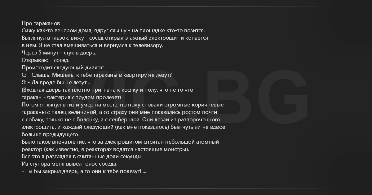 Про тараканов Сижу как-то вечером дома, вдруг слышу - на площадке кто-то возится. Выглянул в глазок, вижу - сосед открыл этажный электрощит и копается в нем. Я не стал вмешиваться и вернулся к телевизору. Через 5 минут - стук в дверь. Открываю - сосед. Происходит следующий диалог: C: - Cлышь, Мишель, к тебе тараканы в квартиру не лезут? Я: - Да вроде бы не лезут... (Входная дверь так плотно пригнана к косяку и полу, что не то что таракан - бактерия с трудом пролезет) Потом я глянул вниз и умер на месте: по полу сновали огромные коричневые тараканы с палец величиной, а со страху они мне показались ростом почти с собаку, только не с болонку, а с сенбернара. Они лезли из развороченного электрощита, и каждый следующий (как мне показалось) был чуть ли не вдвое больше предыдущего. Было такое впечатление, что за электрощитом спрятан небольшой атомный реактор (как известно, в реакторах водятся настоящие монстры). Все это я разглядел в считанные доли секунды. Из ступора меня вывел голос соседа: - Ты бы закрыл дверь, а то они к тебе полезут!.. Спрашивается, на кой он стучался???