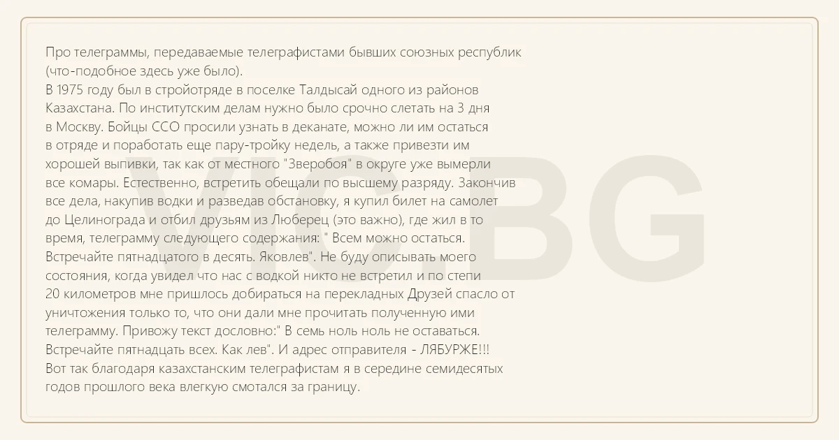 Про телеграммы, передаваемые телеграфистами бывших союзных республик (что-подобное здесь уже было). В 1975 году был в стройотряде в поселке Талдысай одного из районов Казахстана. По институтским делам нужно было срочно слетать на 3 дня в Москву. Бойцы ССО просили узнать в деканате, можно ли им остаться в отряде и поработать еще пару-тройку недель, а также привезти им хорошей выпивки, так как от местного "Зверобоя" в округе уже вымерли все комары. Естественно, встретить обещали по высшему разряду. Закончив все дела, накупив водки и разведав обстановку, я купил билет на самолет до Целинограда и отбил друзьям из Люберец (это важно), где жил в то время, телеграмму следующего содержания: " Всем можно остаться. Встречайте пятнадцатого в десять. Яковлев". Не буду описывать моего состояния, когда увидел что нас с водкой никто не встретил и по степи 20 километров мне пришлось добираться на перекладных Друзей спасло от уничтожения только то, что они дали мне прочитать полученную ими телеграмму. Привожу текст дословно:" В семь ноль ноль не оставаться. Встречайте пятнадцать всех. Как лев". И адрес отправителя - ЛЯБУРЖЕ!!! Вот так благодаря казахстанским телеграфистам я в середине семидесятых годов прошлого века влегкую смотался за границу.