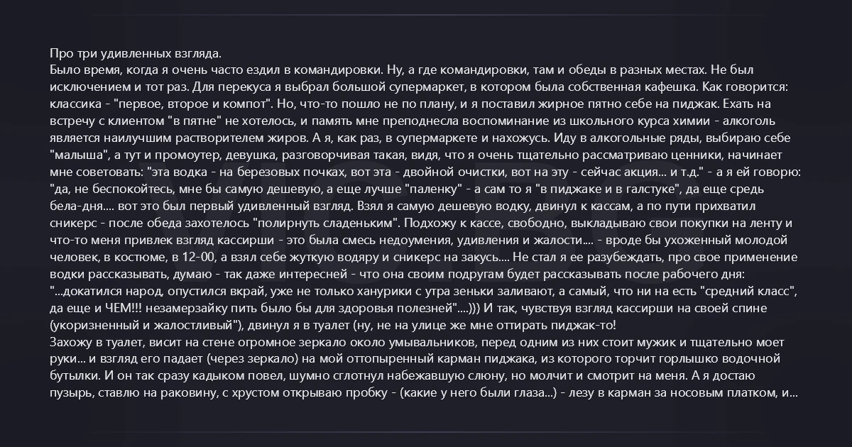 Было время, когда я очень часто ездил в командировки. Ну, а где командировки, там и обеды в разных местах. Не был исключением и тот раз. Для перекуса я выбрал большой супермаркет, в котором была собственная кафешка. Как говорится: классика - "первое, второе и компот". Но, что-то пошло не по плану, и я поставил жирное пятно себе на пиджак. Ехать на встречу с клиентом "в пятне" не хотелось, и память мне преподнесла воспоминание из школьного курса химии - алкоголь является наилучшим растворителем жиров. А я, как раз, в супермаркете и нахожусь. Иду в алкогольные ряды, выбираю себе "малыша", а тут и промоутер, девушка, разговорчивая такая, видя, что я очень тщательно рассматриваю ценники, начинает мне советовать: "эта водка - на березовых почках, вот эта - двойной очистки, вот на эту - сейчас акция... и т.д." - а я ей говорю: "да, не беспокойтесь, мне бы самую дешевую, а еще лучше "паленку" - а сам то я "в пиджаке и в галстуке", да еще средь бела-дня.... вот это был первый удивленный взгляд. Взял я самую дешевую водку, двинул к кассам, а по пути прихватил сникерс - после обеда захотелось "полирнуть сладеньким". Подхожу к кассе, свободно, выкладываю свои покупки на ленту и что-то меня привлек взгляд кассирши - это была смесь недоумения, удивления и жалости.... - вроде бы ухоженный молодой человек, в костюме, в 12-00, а взял себе жуткую водяру и сникерс на закусь.... Не стал я ее разубеждать, про свое применение водки рассказывать, думаю - так даже интересней - что она своим подругам будет рассказывать после рабочего дня: "...докатился народ, опустился вкрай, уже не только ханурики с утра зеньки заливают, а самый, что ни на есть "средний класс", да еще и ЧЕМ!!! незамерзайку пить было бы для здоровья полезней"....))) И так, чувствуя взгляд кассирши на своей спине (укоризненный и жалостливый"), двинул я в туалет (ну, не на улице же мне оттирать пиджак-то!