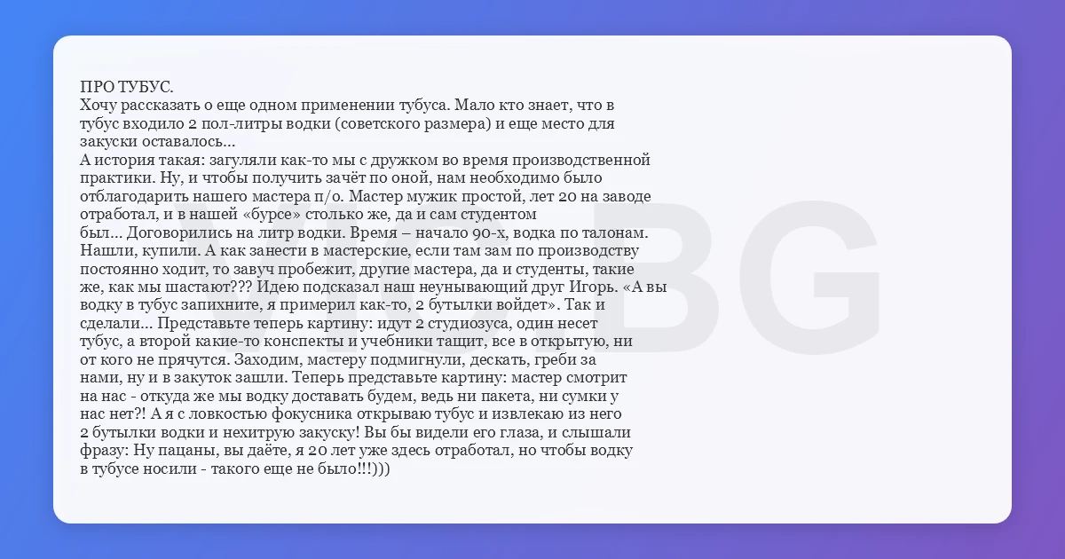 водку в тубус запихните, я примерил как-то, 2 бутылки войдет». Так и