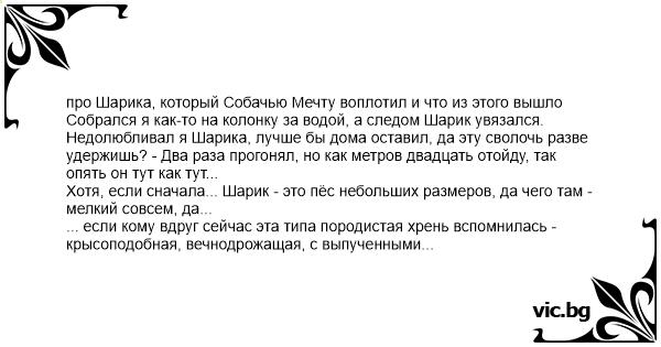про Шарика, который Собачью Мечту воплотил и что из этого вышло Собрался я как-то на колонку за водой, а следом Шарик увязался.