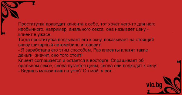 Опять клиент платит и остается доволен. Спрашивает о традиционном секcе. Пpoctиtуtka опять ведет его к окну, показывает на небоскреб и говорит: