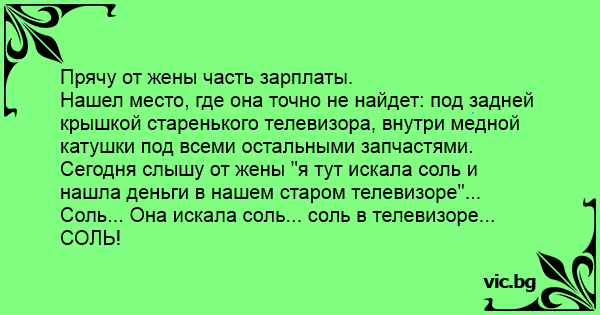 Нашел место, где она точно не найдет: под задней крышкой старенького телевизора, внутри медной катушки под всеми остальными запчастями. Сегодня слышу от жены "я тут искала соль и нашла деньги в нашем старом телевизоре"... Соль... Она искала соль... соль в телевизоре... СОЛЬ!